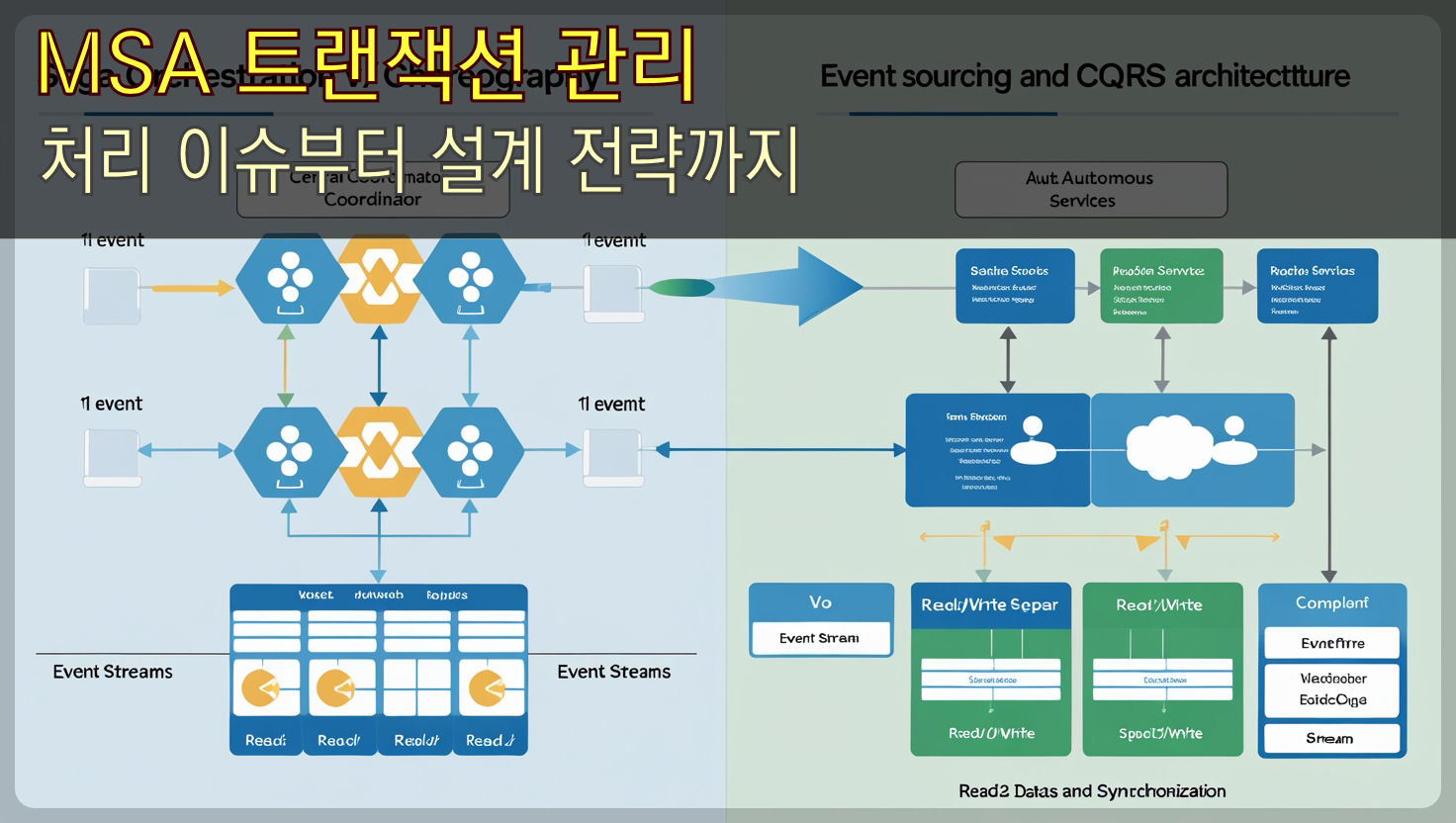 # 주문 처리 예시 def place_order(): try: payment_service.charge() inventory_service.update() shipping_service.schedule() except Exception: payment_service.refund() # 보상 트랜잭션구분 오케스트레이션 코레오그래피 특징 중앙 코디네이터가 트랜잭션 흐름 제어 이벤트 기반 자율 조정 장점 명확한 흐름 제어, 복잡한 로직 처리 용이 서비스 간 결합도 감소 단점 단일 장애점(SPOF) 리스크 디버깅 어려움, 순환 종속성 가능성 - 이벤트 소싱 & CQRS