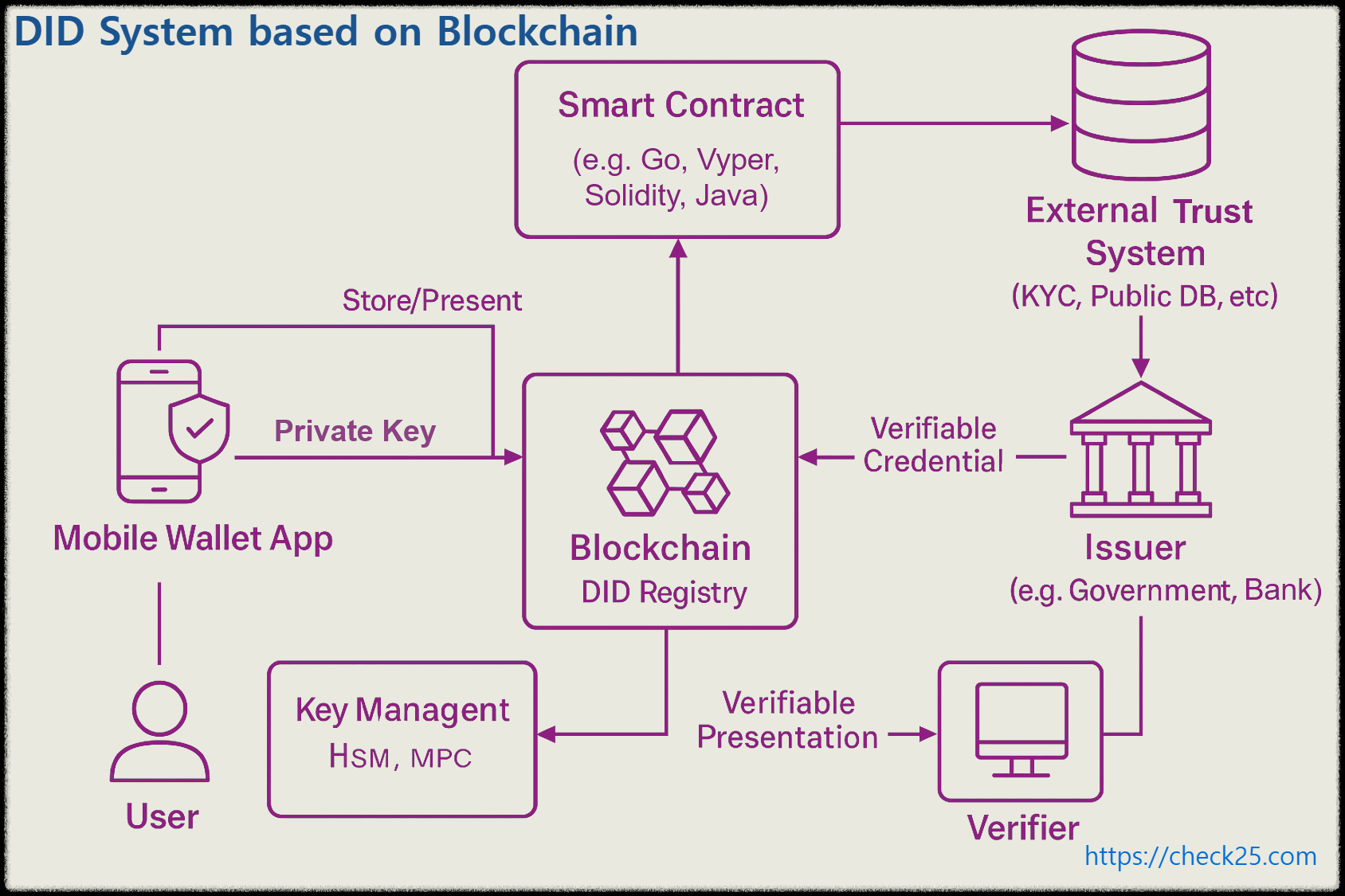 다음은 블록체인 기반 DID 시스템의 핵심 아키텍처에 대한 설명입니다.