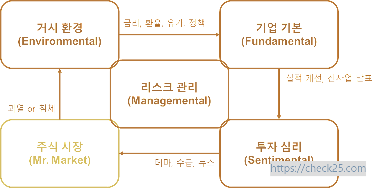 주식 시장을 분석하고 투자를 잘하기 위해서는 단순히 '싸게 사서 비싸게 판다' 이상의 전략과 체계가 필요합니다. Auto3M System의 거시환경(Environmental), 기업 기본(Fundamental), 투자 심리(Sentimental), 리스크 관리(Managemental) 등 4가지 큰 틀에 따라 원리와 원칙을 파악한 뒤, 각각의 요소에서 세부적으로 살펴봐야 할 주요 요인들을 정리하고, 정보 분석을 위한 데이터를 수집하는 방법까지 알아보겠습니다.